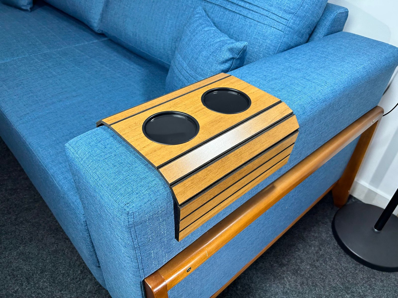 Bandeja esteira flexível para braço de sofá com porta copos.