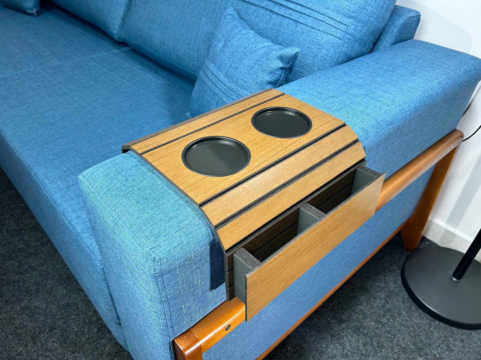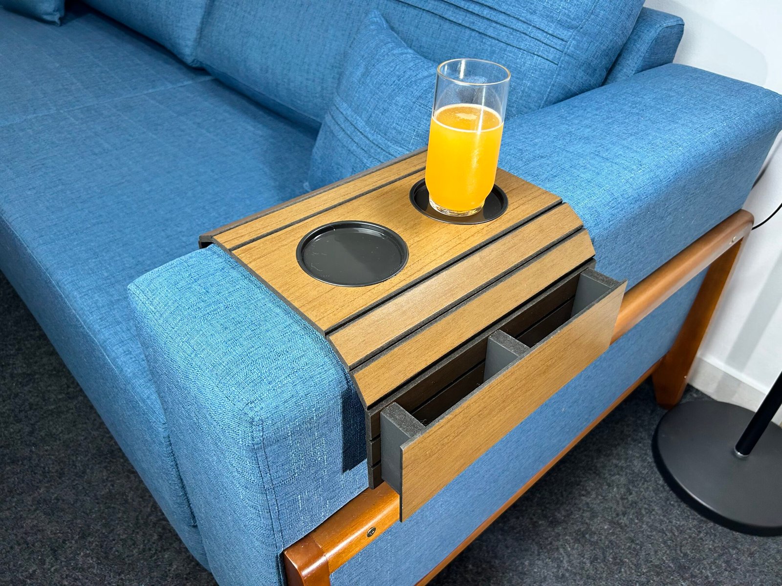 A fim de evitar tragédias derrubando bebidas, comidas, sujeiras no sofá. A esteira oferece boa praticidade e comodidade possuindo um porta copo, porém pode servir perfeitamente para pratos, garrafas e talheres.