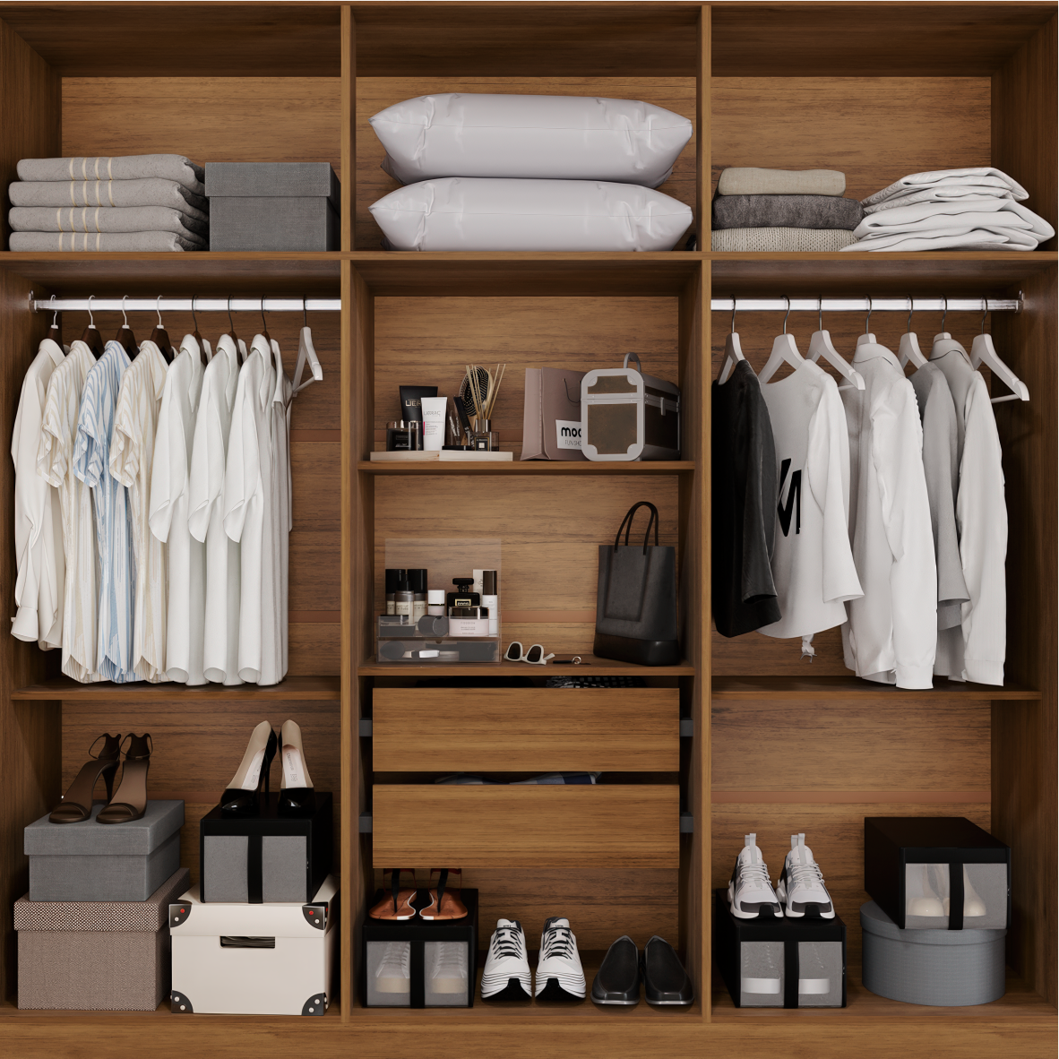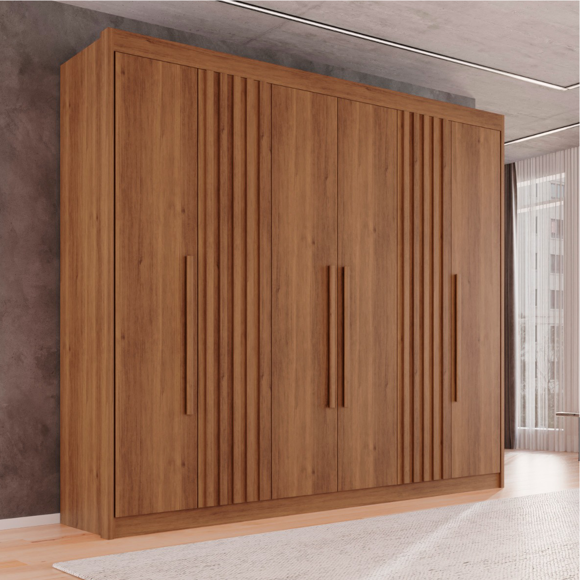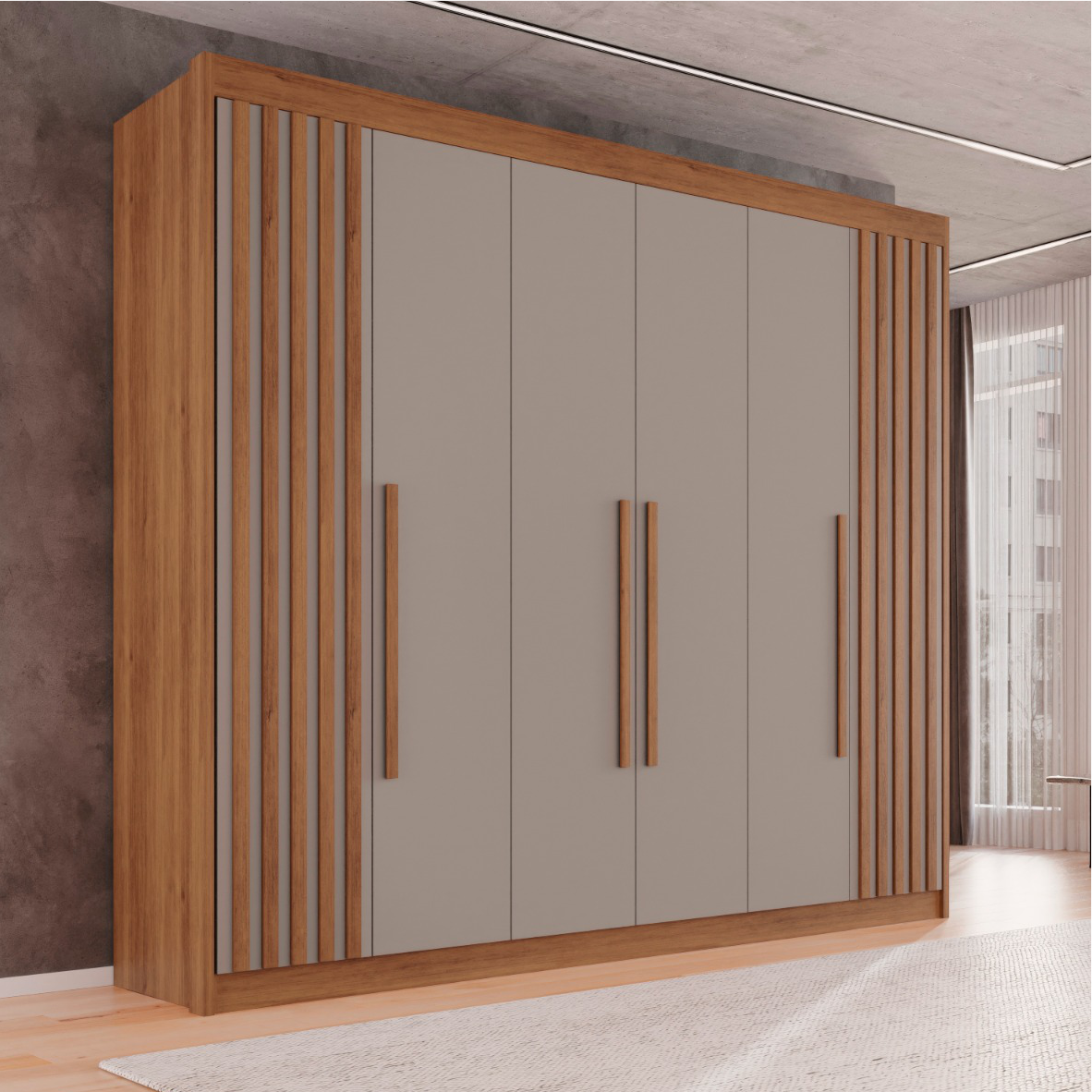 – Puxadores de Madeira – Corrediça Telescópica – Puxadores nas Gavetas – Cabideiro em Alumínio – Conjunto de Pés opcionais – Ripado de Madeira